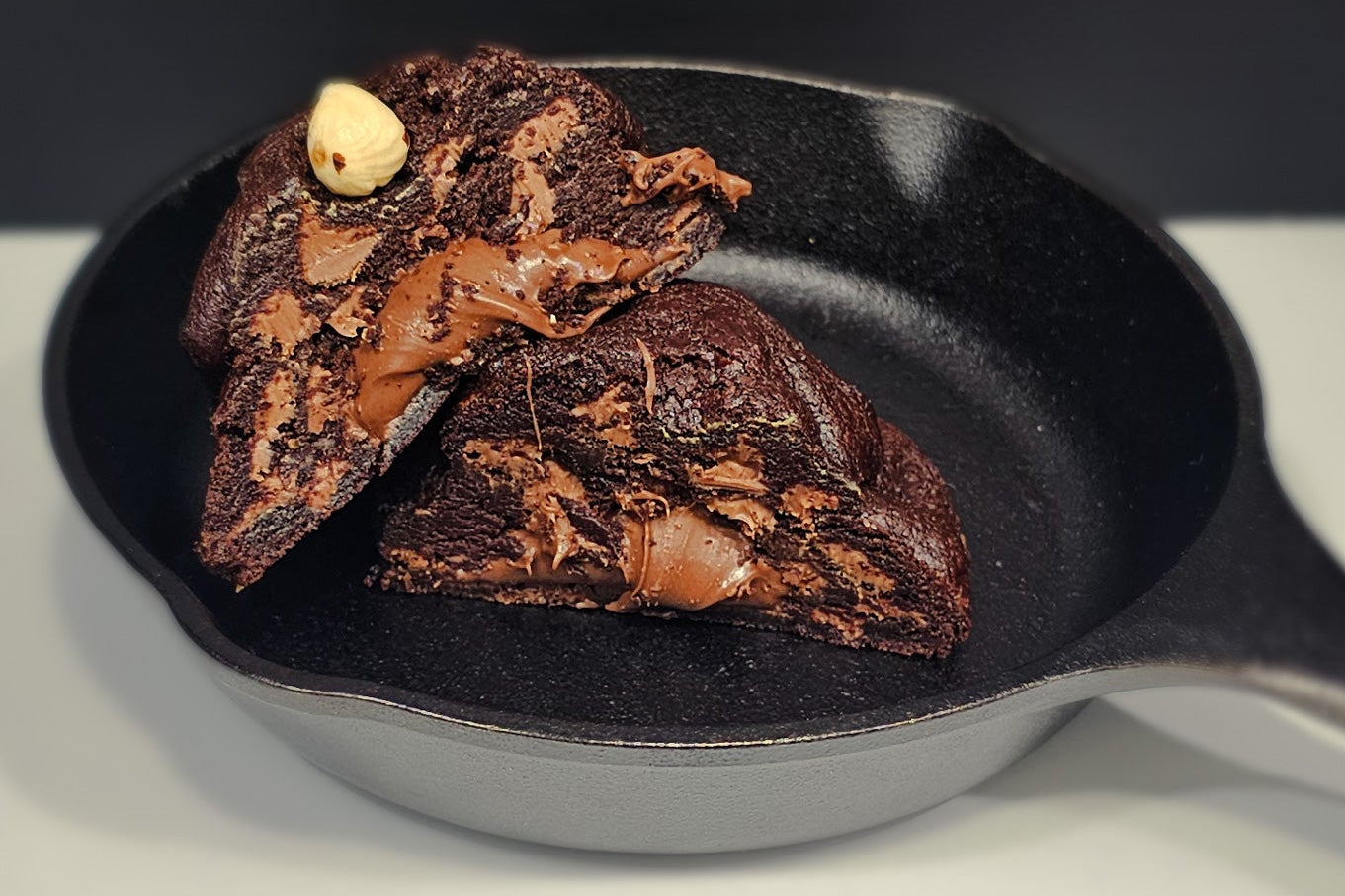 The result of your Step-dad's mother named Hazel and her nutty friend Ellen, addin a hole bunch for Nutella inside of a huge homemade double chocolate chip cookie... mmm doesn't that sound delicious.