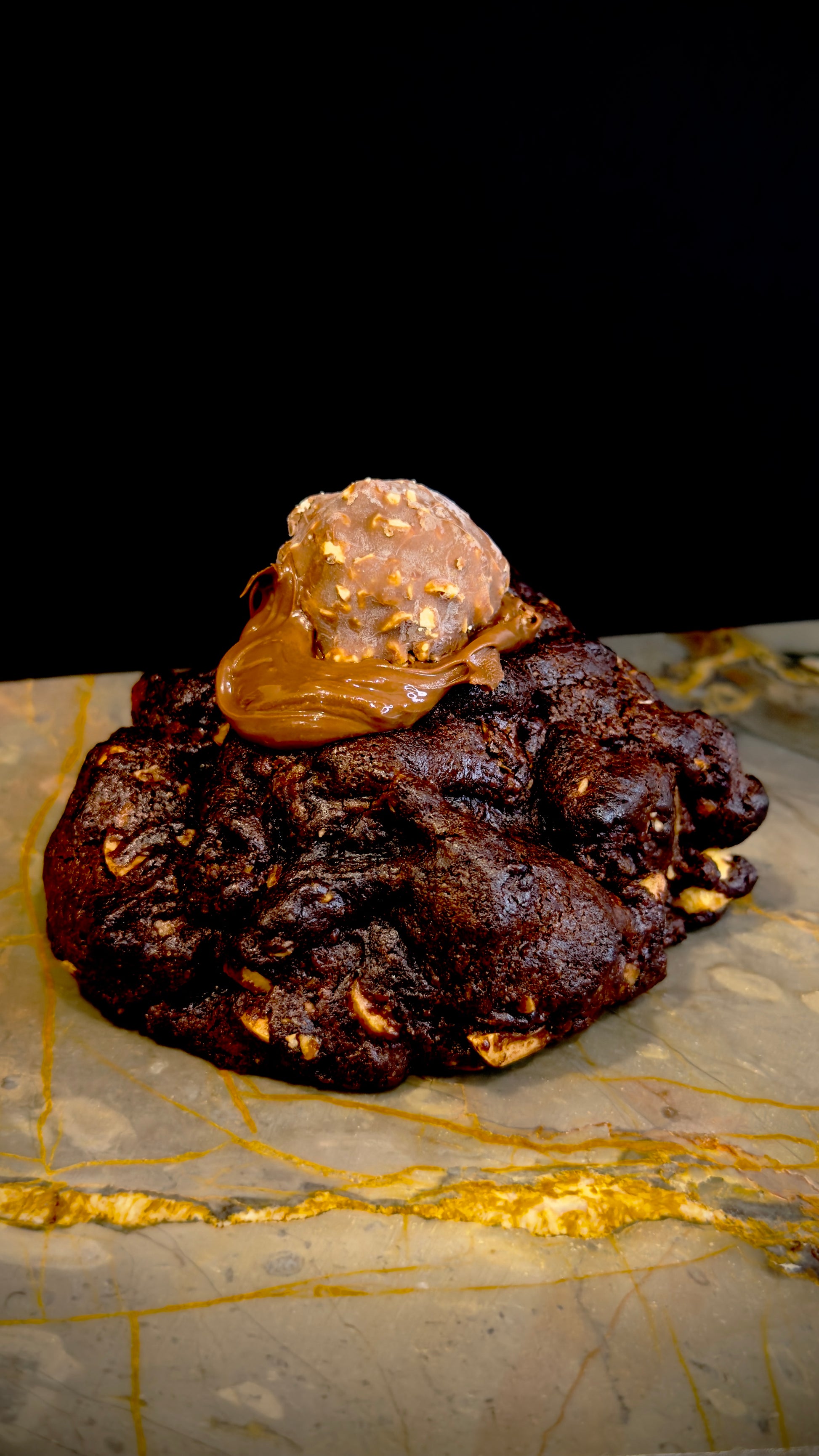 Our double chocolate chip cookie loaded with Hazelnuts, milk chocolate, filled a with Ferrero and Nutella.